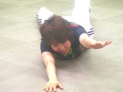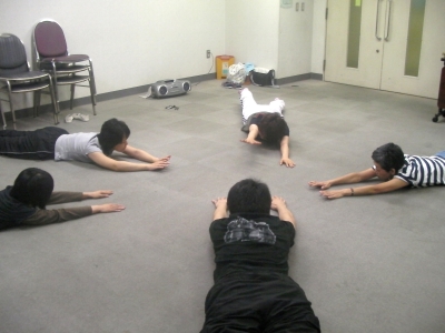 リーダー役は、八乙女真紀子さん(劇団うるとら2B団)。間違ってるストレッチを一人一人直しつつ、アップをやる前とやった後の変化を、自分の心と体で感じてもらいます。