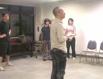 ベンチで座っている人。なにをしているか・・を感じ取ってから、もう一人が登場。与えられた方向性は「ハッピーな展開」のみ。みんなの固い様子に、サルになってもう一度。そしてまた人間に戻ってやってみると・・。