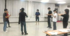 後半は課題から離れて、舞台で渡す、受け取るを意味を実感するためのエチュードや、スローモーションをベースに、体の使い方、感情の開放、集中力の高め方など、それぞれの体で感じられるメニューを。
