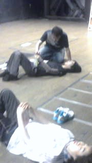 ボイトレ初参加のWさんには、こぐれさんがつきっきりで、発声のメカニズム、基礎を指導。はじめは寝ている状態で、いわゆるタンデンにペットボトルをあててブレス、できるだけゆっくりペットボトルが下がるように吐いていきます。コントを目指すWさん、しっかりした声を出せるようにならないとね。